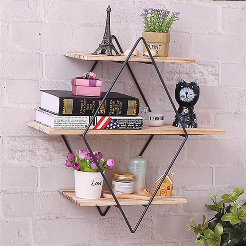 Retro Rhombus Wood Iron Craft Wall Shelf Rack Storage Industrial Style