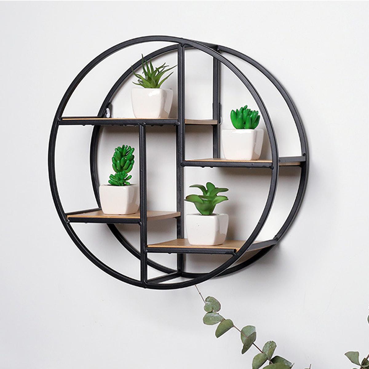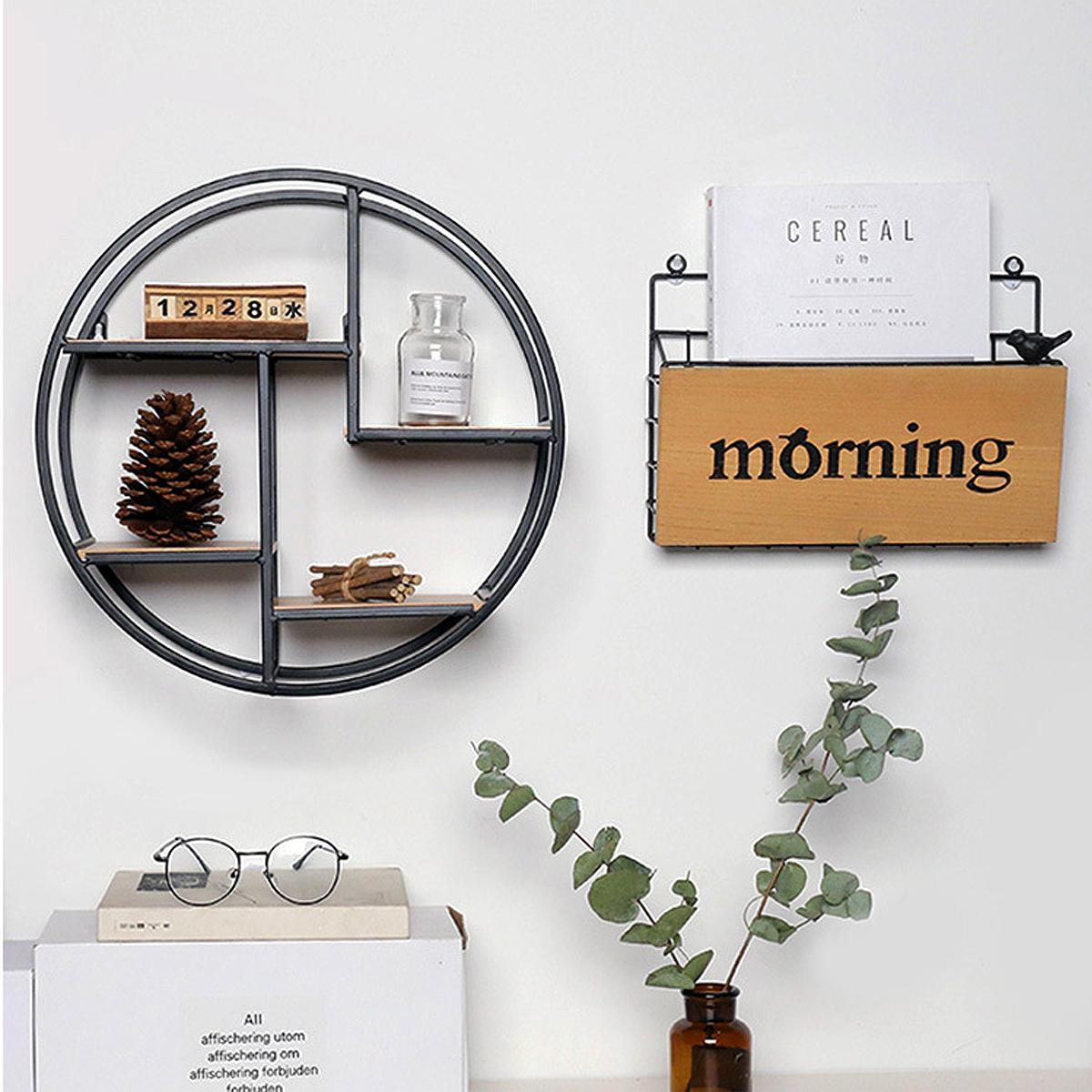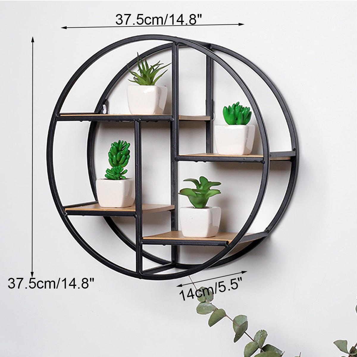 Retro Round Wood Iron Craft Wall Shelf Rack Storage Industrial Style