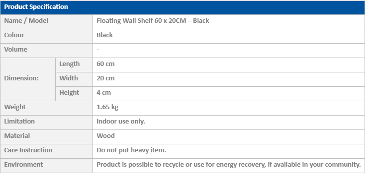 Specifications of Floating Wall Shelf 60 x 20CM - Black